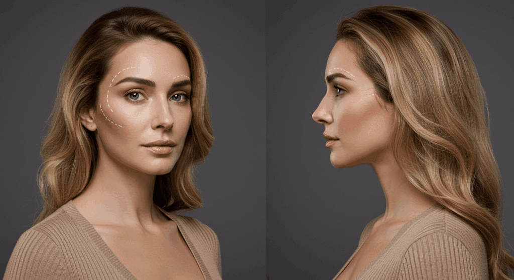 - Endoscopic Brow Lift: Uses several small incisions hidden within the hairline. An endoscope (a tiny camera) guides the surgeon in repositioning forehead muscles and tissues. It is less invasive than traditional but more extensive than a temporal lift.